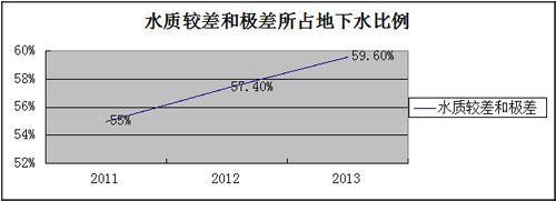 【慧聰水工業(yè)網(wǎng)】地下水是中國北方地區(qū)尤其是華北平原重要的水源,華北地區(qū)百分之八以上的水源取自地下水。筆者成長于華北平原,從小喝著地下水長大,小時每當夏天到來甚至直接飲用剛從地下抽上來的地下水,清涼甘甜。然而,《2013中國國土資源公報》顯示,近60%的地下水水質(zhì)較差。該《公報》顯示,我國地下水水質(zhì)較差和極差兩項的占比達到59.6%,超過了水質(zhì)呈優(yōu)良、良好、較好三類所占的比例。從2011年到2013年,較差和極差級水占比從55%、57.4%上升到59.6%,說明我國地下水水質(zhì)仍在逐步變差。