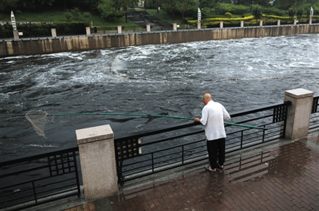 昨天大雨前,慶豐公園附近的通惠河段里,群魚浮出水面,不少市民拿著各種工具來到此處撈魚。