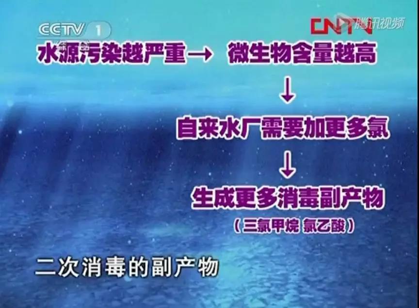 CCTV-1《生活早參考》欄目中有一期節(jié)目,節(jié)目中專家提醒我們,氯氣消毒后會(huì)產(chǎn)生消毒副產(chǎn)物,而這些消毒副產(chǎn)物成百上千倍地增加了飲用水的致癌風(fēng)險(xiǎn)。
