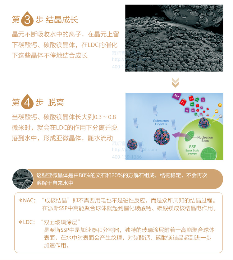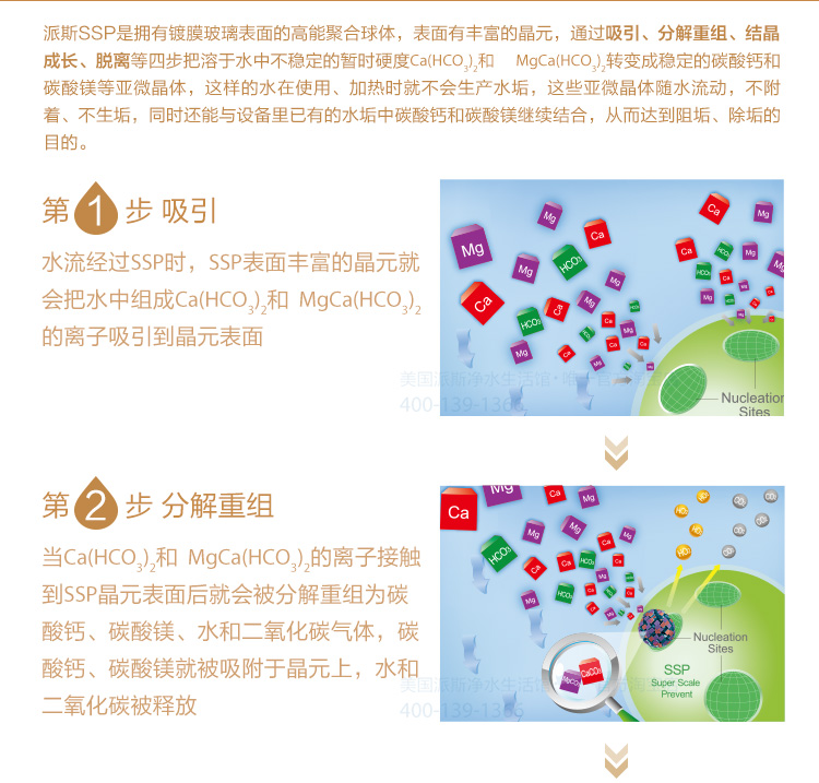 派斯無鹽軟水機(jī),采用的就是納米晶無鹽軟水技術(shù)是新型的物理軟水方式,借助派斯SSP高能聚合球體,通過吸引、分解重組、結(jié)晶成長、脫離等四步把溶于水中不穩(wěn)定的暫止硬度的碳酸氫鈣、碳酸氫鎂轉(zhuǎn)變成穩(wěn)定的碳酸鈣和碳酸鎂的亞微晶體,這樣的水在使用、加熱時(shí)就不會(huì)生成水垢;這些亞微晶體隨水流動(dòng),不附著、不生垢,同時(shí)還能與設(shè)備里已有的水垢中的碳酸鈣和碳酸鎂繼續(xù)結(jié)合,從而達(dá)到阻垢、除垢的目的。