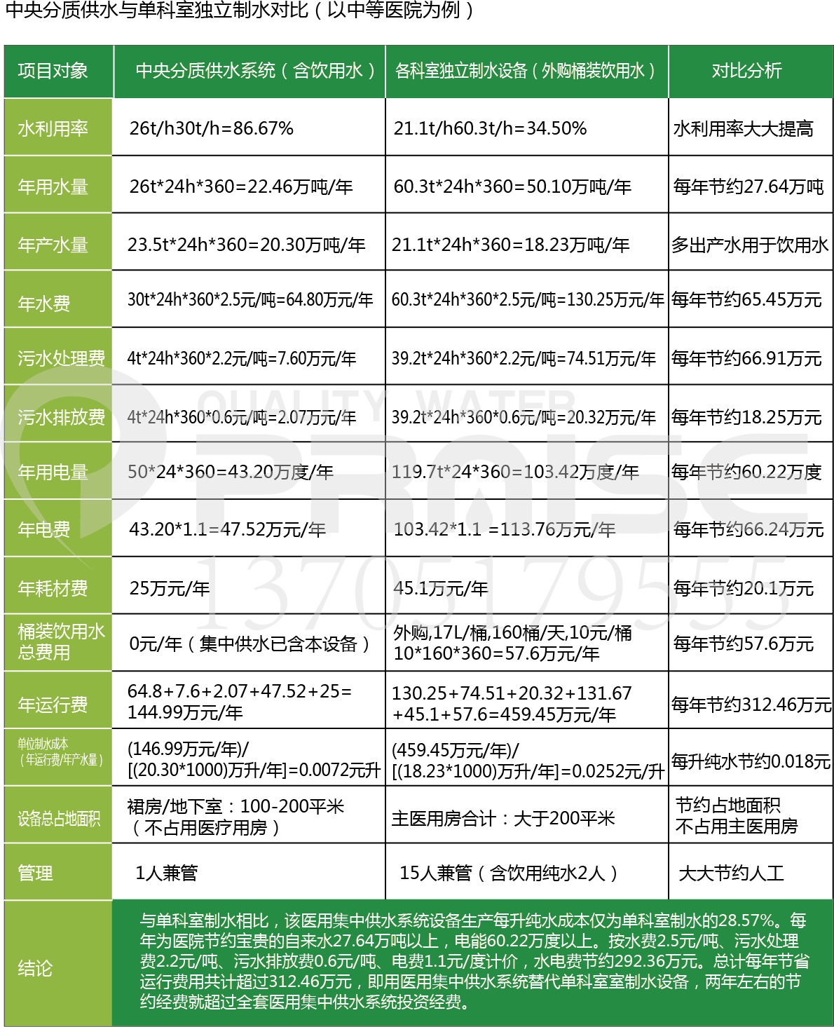 以中等醫(yī)院為例,采用中央分質(zhì)供水與單科室獨(dú)立制水對(duì)比:該醫(yī)用集中供水系統(tǒng)設(shè)備生產(chǎn)每升純水成本僅為單科室制水的28.57%。每年為醫(yī)院節(jié)約寶貴的自來(lái)水27.64萬(wàn)噸以上,電能60.22萬(wàn)度以上。按水費(fèi)2.5/噸、污水處理費(fèi)2.2/噸、污水排放費(fèi)0.6/噸、電費(fèi)1.1/度計(jì)價(jià),水電費(fèi)節(jié)約292.36萬(wàn)元。總計(jì)每年節(jié)省運(yùn)行費(fèi)用共計(jì)超過(guò)312.46萬(wàn)元,即用醫(yī)用集中供水系統(tǒng)替代單科室室制水設(shè)備,兩年左右的節(jié)約經(jīng)費(fèi)就超過(guò)全套醫(yī)用集中供水系統(tǒng)投資經(jīng)費(fèi)。